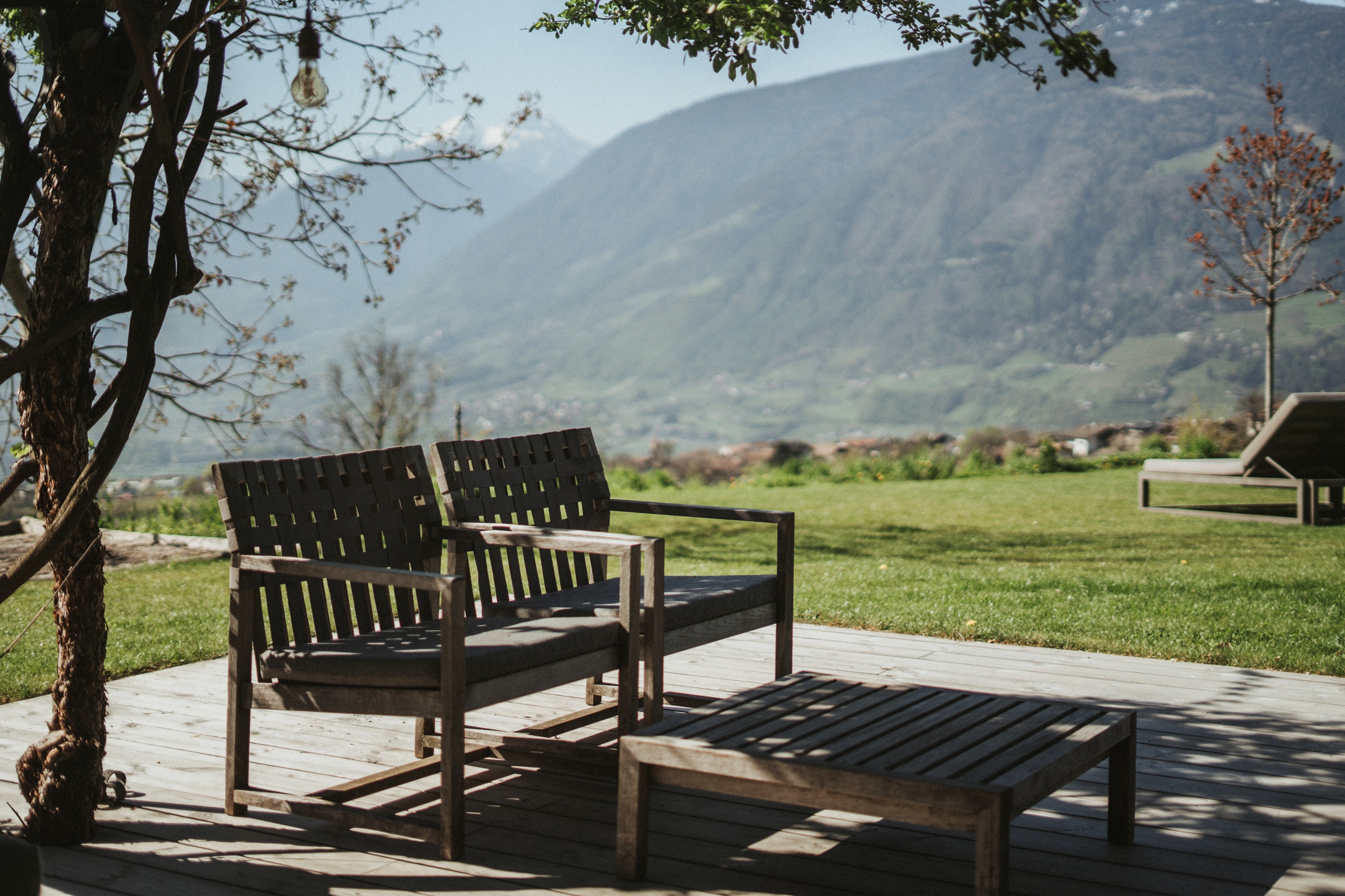 Ihre persönliche Insel in den Bergen: unverbaute Weitblicke auf Meran, Wälder und die umliegende Bergwelt auf 35.000 m² Grünfläche direkt vor Ihrem Zimmer.