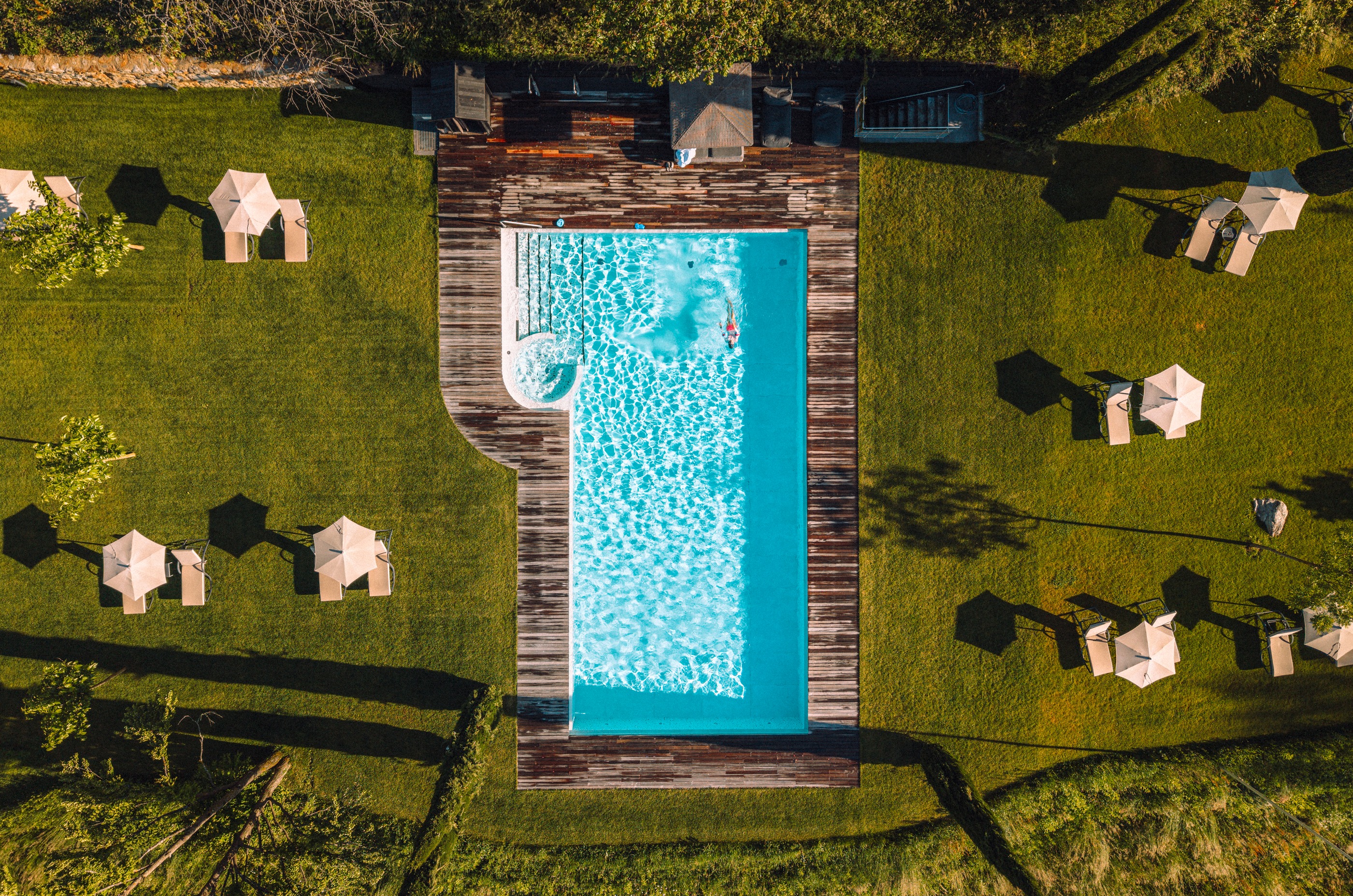 Schwimmen Sie mit Blick auf Merans Citylights im beheizten Pool mitten auf der Liegewiese und genießen Sie frische Drinks direkt am Beckenrand.